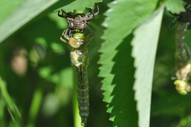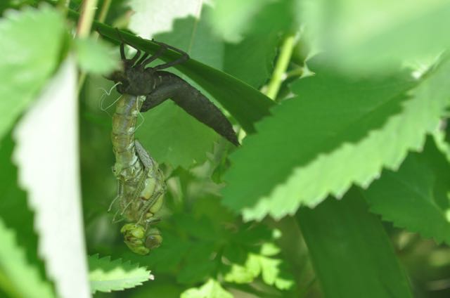 On Wednesday 26 June I shared an exciting morning with my neighbour, and fellow member Jill, in her garden watching Southern Hawker dragonflies emerging from their nymph bodies. The nymphs were attached to the plants surrounding Jill’s pond and Jill found 4 on the same day. They split their skin and popped out as winged adults. It took about 3 hours to complete the process so Jill very kindly provided tea and cake while we watched and waited. Luckily it was a sunny morning. When we watched one dragonfly leave, we weren’t alone. A sparrow flew down with amazing speed and nearly had the dragonfly but our shouts of alarm scared it off and the dragonfly lived to see another hour or so (perhaps).
