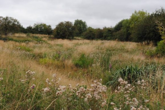 Natural flood management scheme. Water drains slowly into a pond and then into the Evenlode. A rich habitat for wildlife.