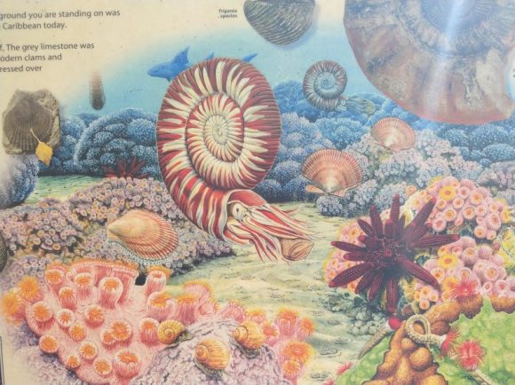 An information board gave an idea of what lived in the sea at the time – ammonites, coral reefs, sea urchins, and a particularly strong shelled bi-valve, Trigonia, which was able to withstand the buffeting of the waves. Is consequently well preserved and gives its name to the Upper and Lower Trigonia Rock beds which are of such importance that the quarry has the status as a geological SSSI.