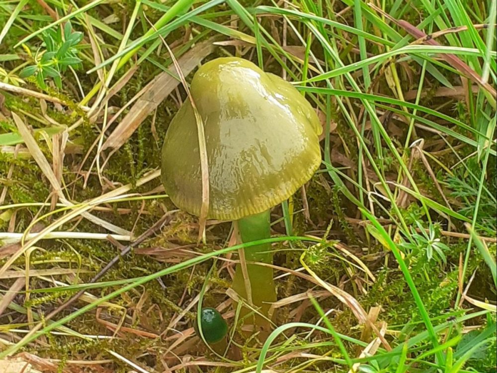 We then drove a short distance to Matthew Arnold field near Jarn Mound. Here we saw a vermillion waxcap (Hygrocybe miniata) which was identified due to its cap being covered in fine scales; it’s very similar to spangle and scarlet waxcaps. A little further on we saw an oily waxcap (Hygrocybe quieta) which had an orange yellow cap and a similar coloured stem.
