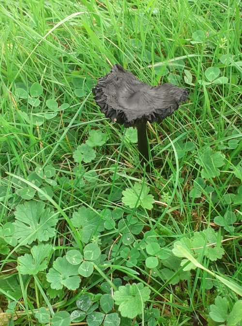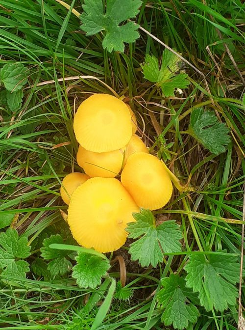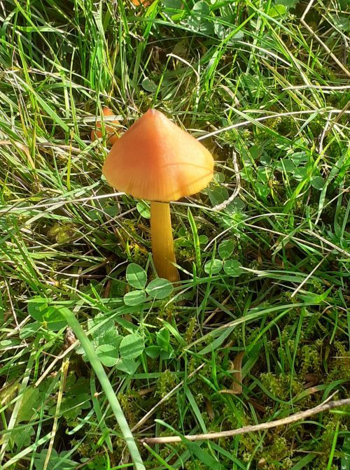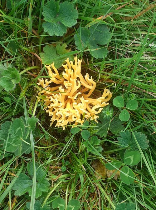 We saw five different species of waxcaps in this field (snowy, blackening, parrot, butter and honey waxcaps). My favourite was the parrot waxcap (Gliophorous psittacinus) with its glistening slimy emerald green cap as seen in the fresh young specimens. The stem is yellow at the base and the top half is green, as it matures the green colours fade to yellow. The blackening waxcaps (Hygrocybe conica) emerge with orange or scarlet caps which blacken with age and exposure to air. This was probably the most common waxcap in the field and we saw it in different stages of colour. Other fungi in the field included spindle coral (Clavulinopsis fusiformis) which are part of a large group of fungi with neither gills or pores. The spores develop on the outside of the fruiting body and are dispersed by wind or rain on maturity.