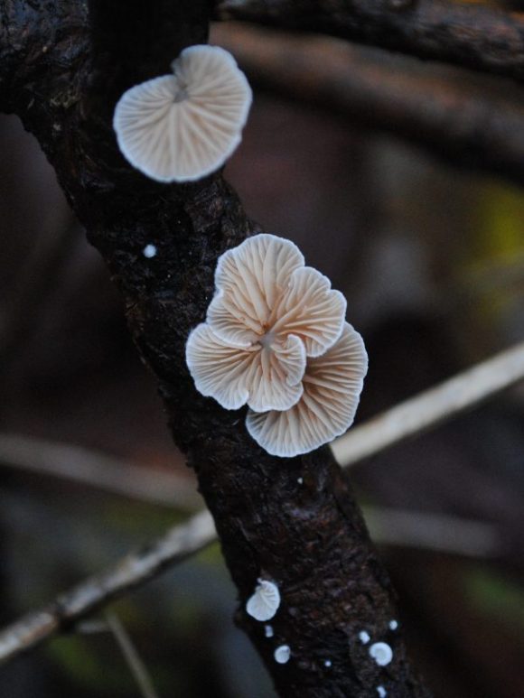 Whilst Oyster mushrooms and Oysterlings don’t seem to be closely related, they share the characteristics that they are both stemless and grow on dead wood. Whilst Oyster mushrooms are said to be good to eat, the edibilty of Oysterlings is doubtful; in any case they are really too small to bother with!