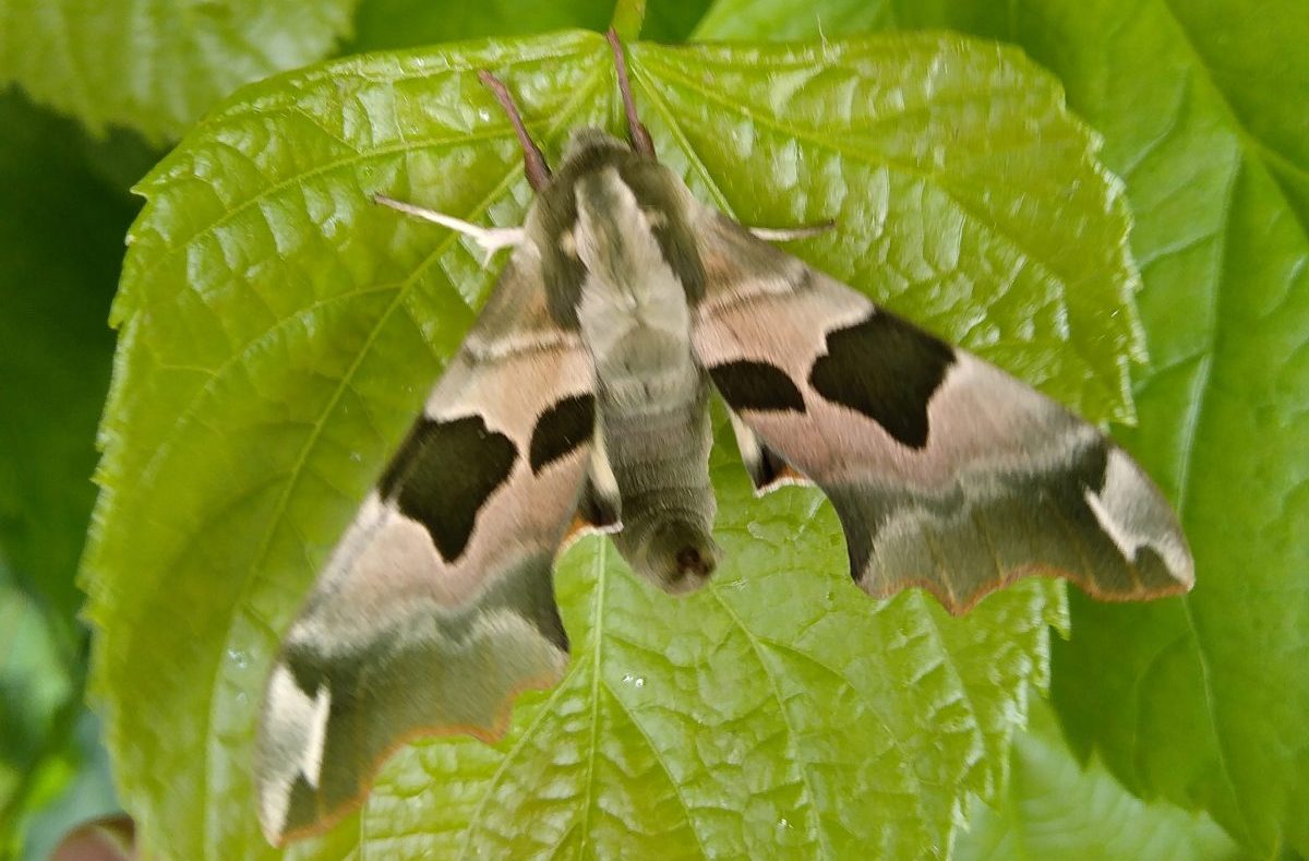 I know there are lime hawkmoths in the lime trees in my road, because every summer I find a few of their caterpillars on the pavement….