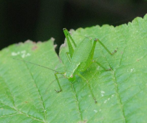 After the group had thanked Tim for a wonderful visit, John and I went back to the first slope that we had visited and found a bench for lunch with a truly stupendous view over what looked like the whole of Oxfordshire. A final bonus for me was spotting a speckled bush cricket nymph sunning itself on a bramble leaf!