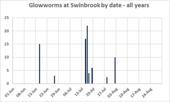 We usually visit – as the graph shows – in mid-July, but it also shows that glowworms can be found at least from any time between mid-June and early August. It would be worth going back there both earlier and later. However, there is the slightest suggestion that the best time to look for them is in mid-July. (The trouble with June is that it gets dark so late!)