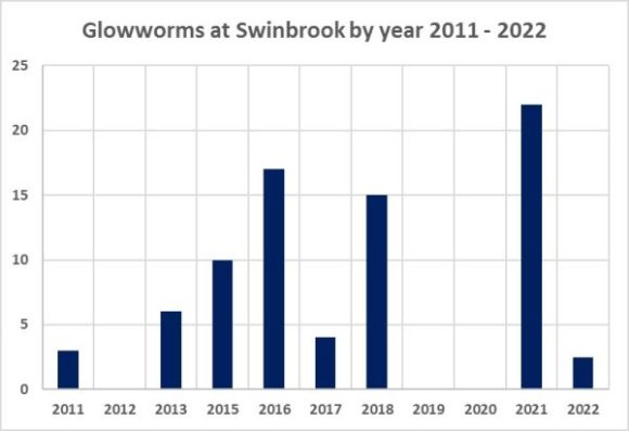 The graph above shows the average number of glowworms recorded by year, from 2011 to 2022. There are so many variables that it’s pretty difficult to draw any firm conclusions except that – perhaps with the exception of this year – the population seems stable. A record from 1991 is for ten, which is the overall average number. With the exception of 2022, there is a very slight suggestion that numbers might be increasing – or simply that we are better at finding them.