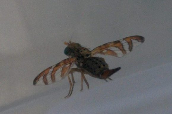The photos are a bit fuzzy because they were taken through the walls of plastic specimen bottles (the flies were later released unharmed).