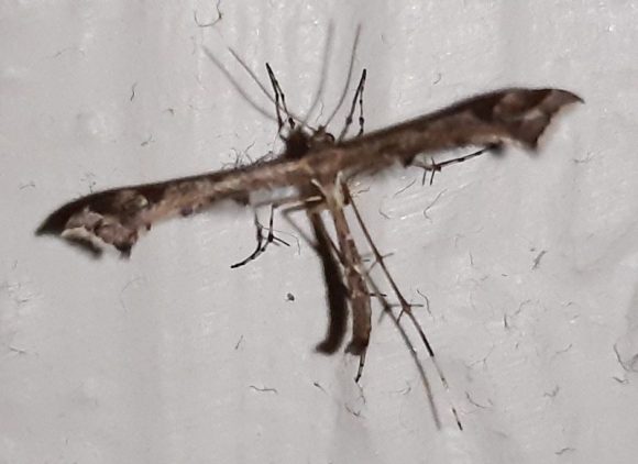 Getting home quite late from a nocturnal ramble to look (actually to listen for) for crickets with bat detectors, I noticed an unusual plume moth on the inside of the bathroom window.