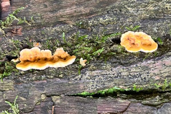 We started our walk through the dappled shade of silver birch and sweet chestnut woods. Here there are several hollows where flint or possibly gravel may have been extracted. In normal years these would be pretty wet and covered in moss, but after the hot summer and dry autumn the ground was only damp and there were fewer mosses. We noted Hairy Curtain Crust and Turkeytail on logs, Glistening Inkcap, Birch Bracket and Brown Rollrim. We learned about each of the fungi in terms of recognition, preferred habitat and taste (although not in some cases!)