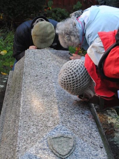 Gravestones are conveniently near one and other and they can be studied safely, in detail and in a comfort not often associated with observation in the field! We were all provided with a hand lens and were encouraged to use them in the time-honoured scientific practice of “look, observe, recognise and record”.