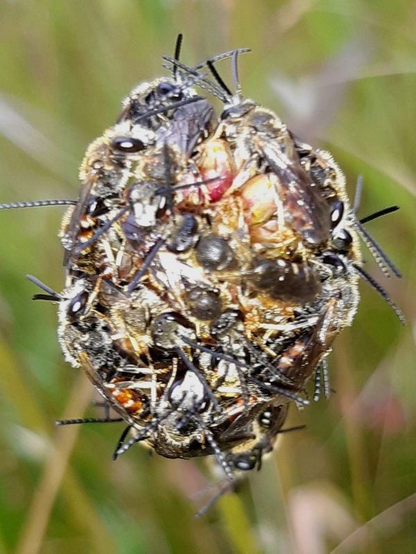 We couldn’t, then, work out what they were doing. The stamens of the plantain had long gone so they weren’t after pollen, and they didn’t seem to be mating.