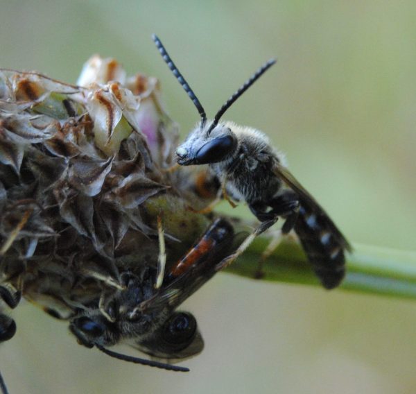 What intrigued us was that they were congregating on the flower head of a single ribwort plantain; there were plenty of other plantains nearby but they all chose the same one. Eventually the flower spike was black with bees. They were hard to count but there must have been twenty or thirty of them.