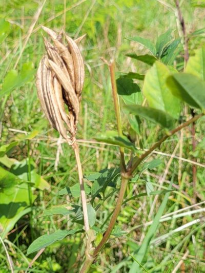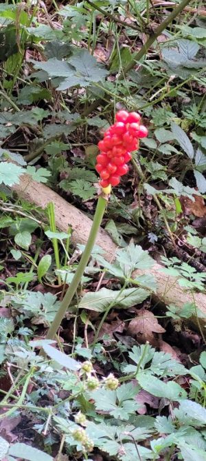 Further along the nature trail, we entered the wood and were delighted to see a clustered bellflower and enchanters’ nightshade. We descended the steep slope to the stream and fen, where Maggie spotted ragged robin, marsh thistle, purple loosestrife and bulrush.