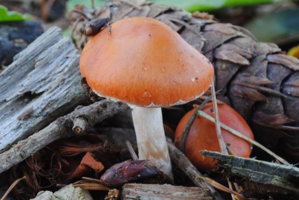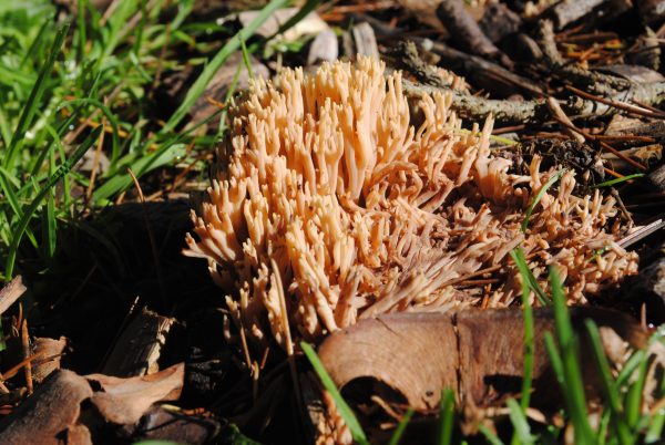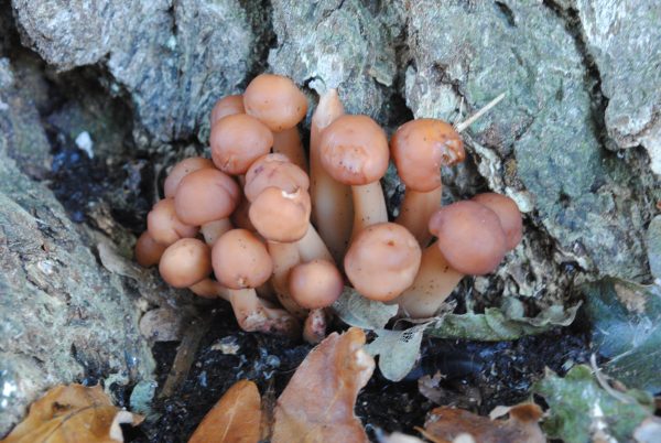 There were quite a lot of parasols, Macrolepiota procea, present, especially in the meadow area. The woodchips used as a mulch at the bases of some of the trees were a rich habitat for fungi, particularly redlead roundhead, Leratiomyces ceres, and a coral fungus, possibly upright coral, Ramaria stricta. Some spindle toughshanks, Collybia fusipes were growing at the base of a huge oak. (Note: these ID’s are tentative and should be confirmed by an expert!) There were probably other fungi to be found had we looked more closely.
