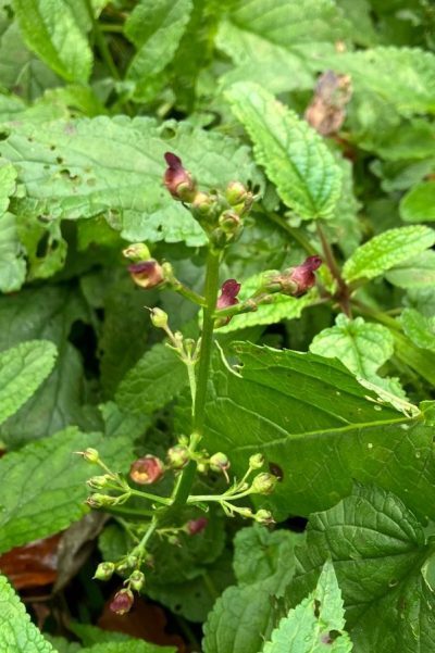 Further on the path is surrounded by deciduous woodland of beech, lime, sycamore, maple and sweet chestnut. There appear to be several species of lime, some with the ‘skirt’ of twiggy growth around the base of the trunk, known as ‘epicormic’, while others had none. To either side of the path are tree trunks piled high, presumably felled when constructing the path. These make a perfect habitat for a wide variety of fungi. Some were hard to identify but still in good condition despite all the rain. A few sleepy 2-spotted ladybirds were hiding under thistle heads to keep dry.
