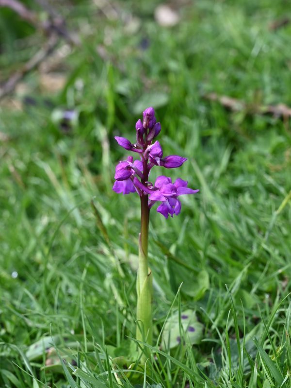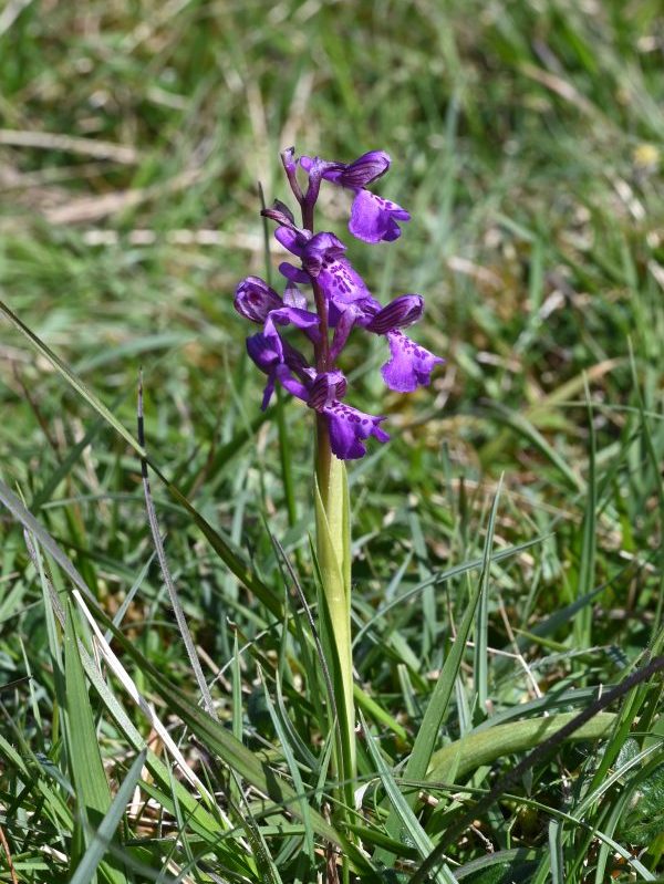 A fair number of other plants, as well as the Pasque flowers, were flowering. In particular the small, but deep blue Common Milkwort (Polygala vulgaris) and, further along the valley, both Early Purple and Green-winged Orchids which gave us the opportunity to study the differences between them. St George’s Mushrooms were growing on some longer, lusher grass nearby.
