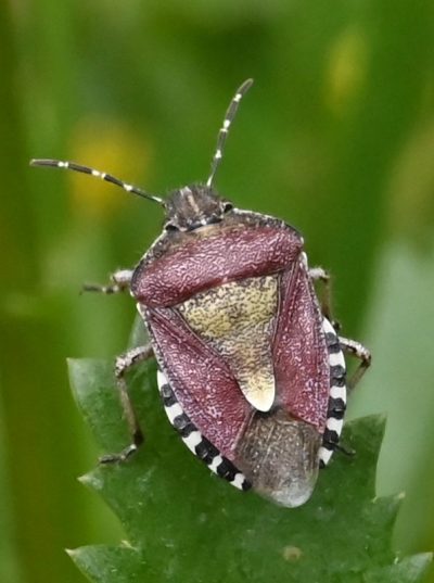 The only other things of note were a nice hairy (aka sloe) shield bug and a tiny bee – still to be identified – foraging in the Canterbury bells.