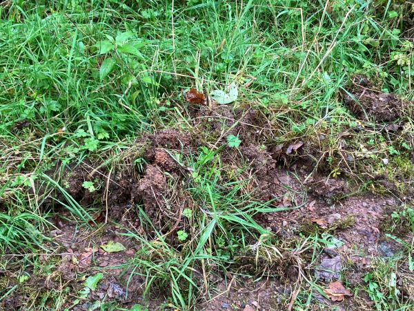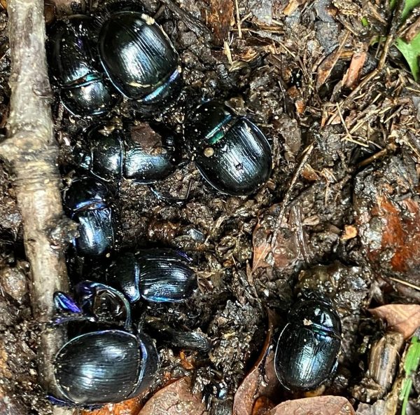 Various birds were heard, but few seen, (see list). The most striking find on our walk was an amazing amount of Woodland Dor Beetles. These compact, shiny black beetles feed on rotting vegetation, decaying fungi as well as dung. They mate in the spring and the females burrow under a pile of rotting vegetation or dung, creating brood chambers where the eggs are laid. Larvae develop through summer and adults emerge in autumn to feed, hence our sightings. Initially we saw only individuals scurrying about, but then found a collection of at least twelve appearing to be burrowing, so probably returning to winter underground. Later we walked through an area largely planted with conifers and saw no beetles, so it would appear that they have a preference for deciduous woodland.