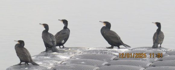 On arrival at the north east corner of Reservoir 2 we had close views of some of the many coots, mallards and tufted ducks that visit the site at this time of year ; they are of course used to people. Several redwings, a song thrush, starlings and goldfinches were searching for food on a grassy area near some of the nearby laboratory buildings and as we started to cross the Causeway between the two major waterbodies, a small flock of cormorants were loafing very close to us on the sloping