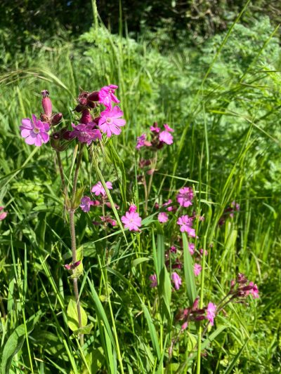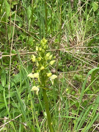 Much of the land around the solar farm is designed with nature in mind so there are wildflower meadows, a rough area, a laid elm hedge, a winter pond, and a heritage apple orchard. There were many wild flowers to be seen despite the recent dry weather and a good number of birds seen or heard. Some of the highlights included seeing a Greater butterfly-orchid and a good number of butterflies (small heath, small blue, small white, painted lady). Banded demoiselles were spotted near the river and many mayflies (3 tails) – some discussion whether they were stoneflies (2 tails). The weather was perfect – not too hot or chilly. Many volunteers work there, and more are always welcome. Many thanks to Anne for leading us, and to Brenda for compiling the species list, which can be found here