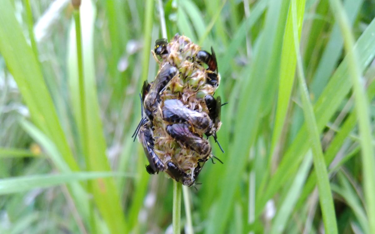 Sue Morton writes: Keen followers of the blogs on our website may remember that last year I had large numbers of common furrow bees spending the night on ribwort plantains in my uncut lawn. The conclusion was that they were probably males roosting communally. I was very pleased to see that they have returned this year, not only to the same plant species but to an almost identical place in the lawn.