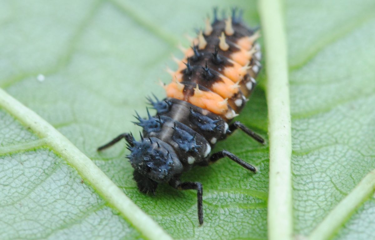 Harlequin Ladybird larva on leaf of Lime tree; Hailey Road.