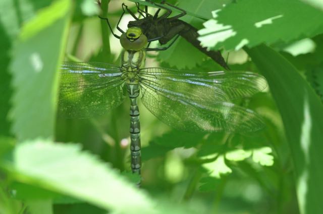 On Wednesday 26 June I shared an exciting morning with my neighbour, and fellow member Jill, in her garden watching Southern Hawker dragonflies emerging from their nymph bodies. The nymphs were attached to the plants surrounding Jill’s pond and Jill found 4 on the same day. They split their skin and popped out as winged adults. It took about 3 hours to complete the process so Jill very kindly provided tea and cake while we watched and waited. Luckily it was a sunny morning. When we watched one dragonfly leave, we weren’t alone. A sparrow flew down with amazing speed and nearly had the dragonfly but our shouts of alarm scared it off and the dragonfly lived to see another hour or so (perhaps).