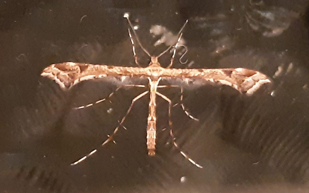 Getting home quite late from a nocturnal ramble to look (actually to listen for) for crickets with bat detectors, I noticed an unusual plume moth on the inside of the bathroom window.