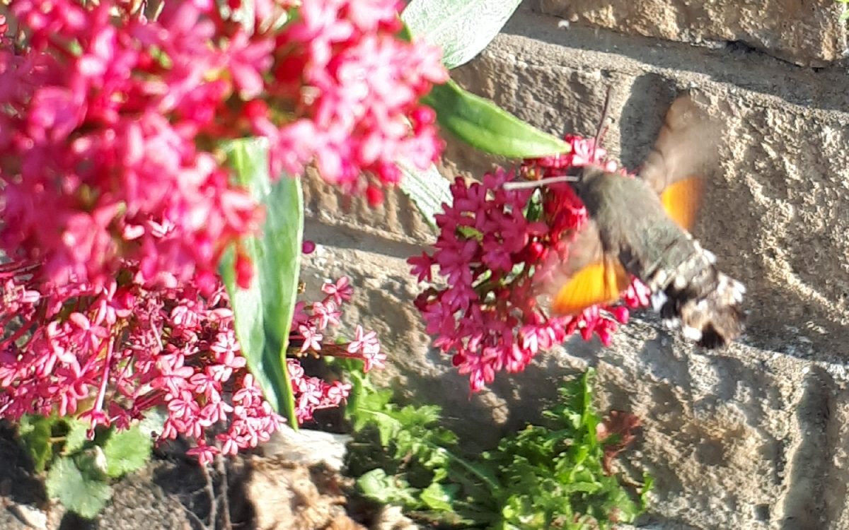 Spotted on our usual Saturday stroll to Cafe Rouge this morning, a hummingbird hawk moth was also enjoying a sunny breakfast on some valerian flowers in Gloucester Place.